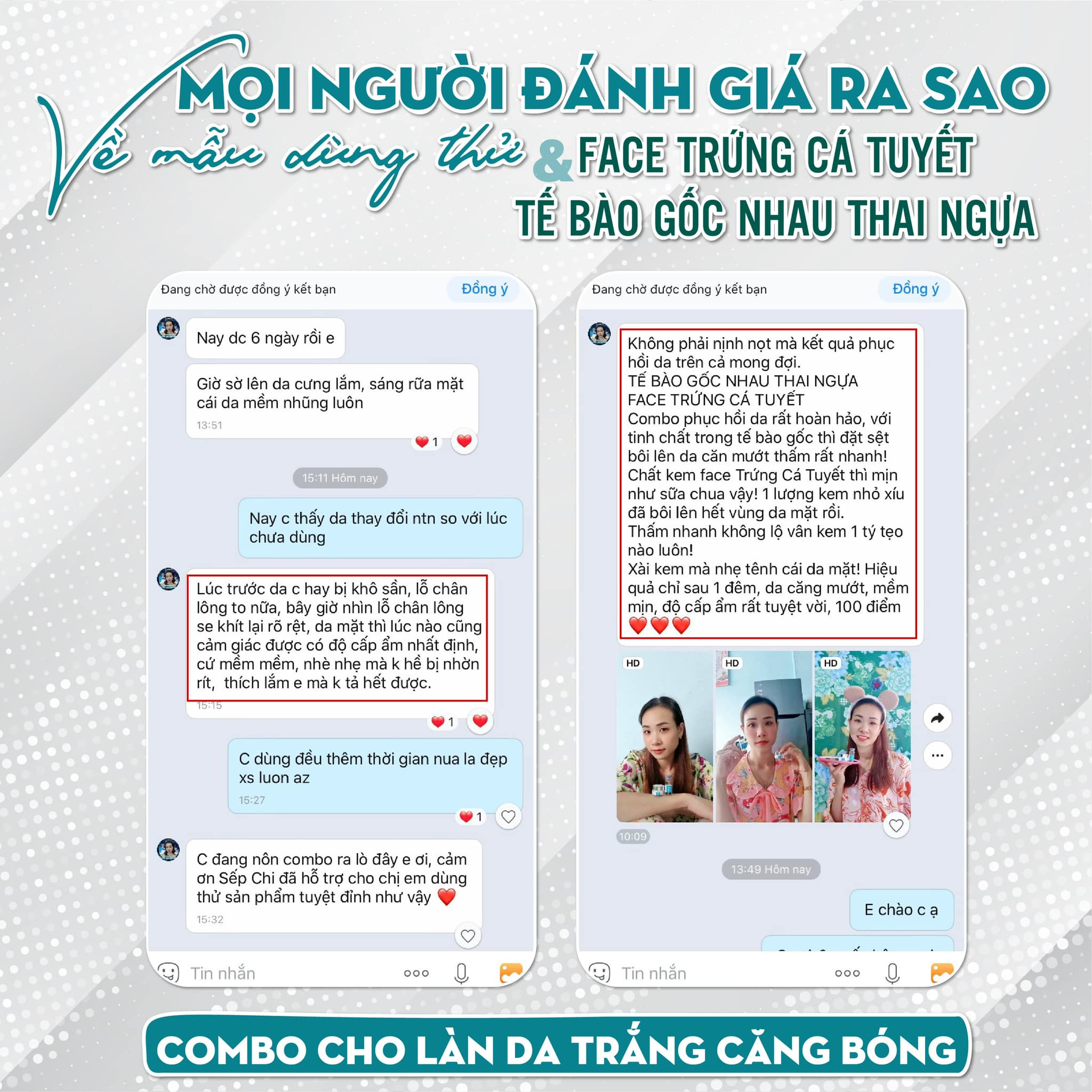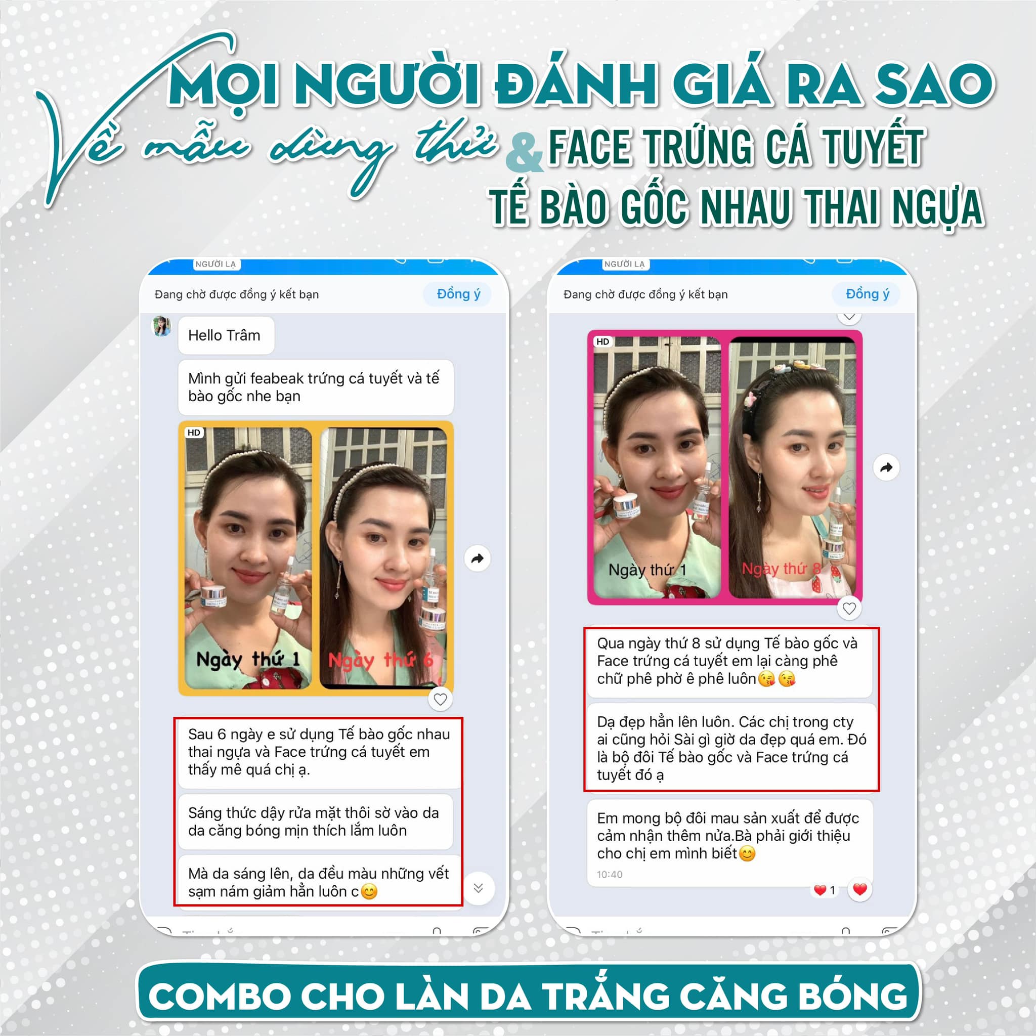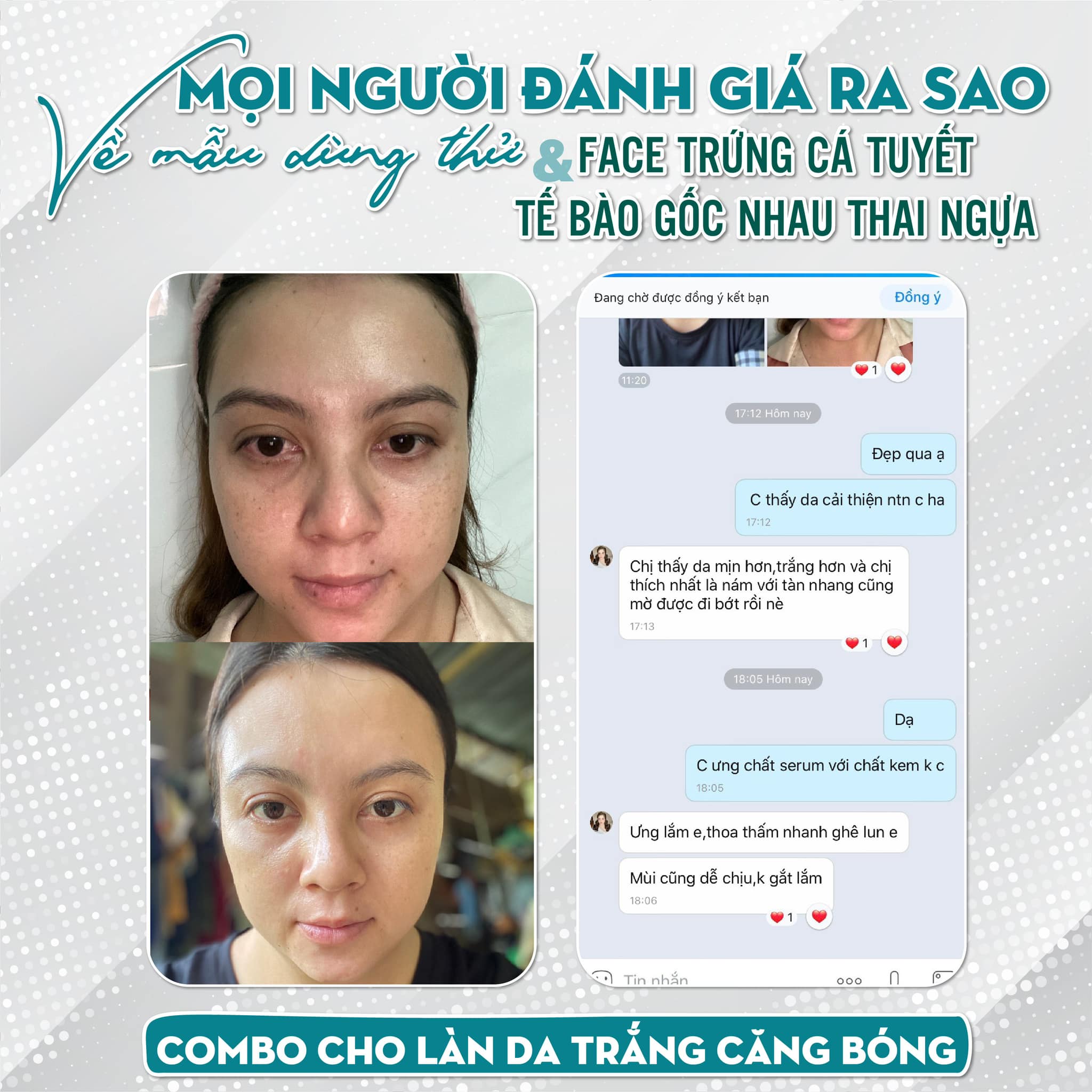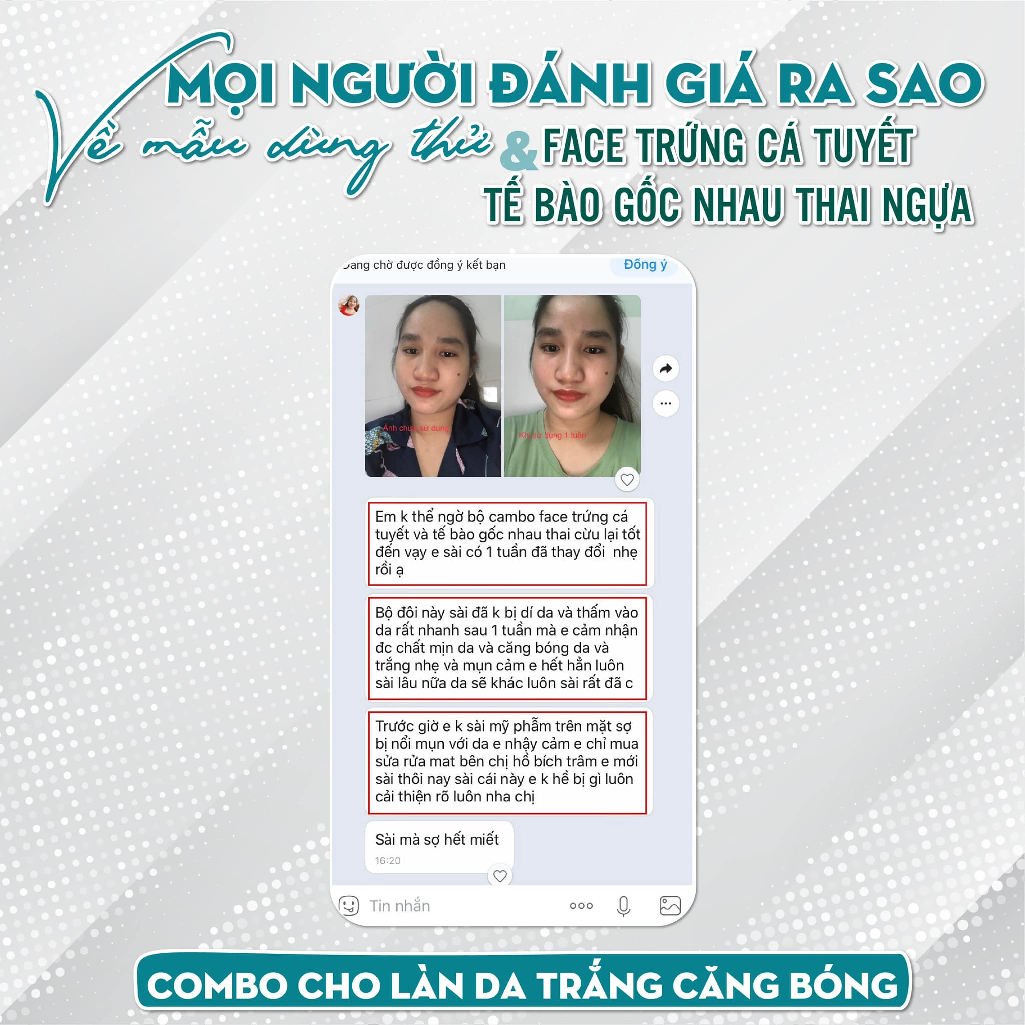 - Sử dụng bộ đôi này không bị bết dính, không lộ kem, thoa là thấm và mềm da, cấp ẩm duy trì độ ẩm cho da cả ngày. Làn da khô hay da mẫn cảm dùng combo face trứng cá tuyết và tế bào gốc nhau thai ngựa da sẽ luôn mềm mịn căng bóng.