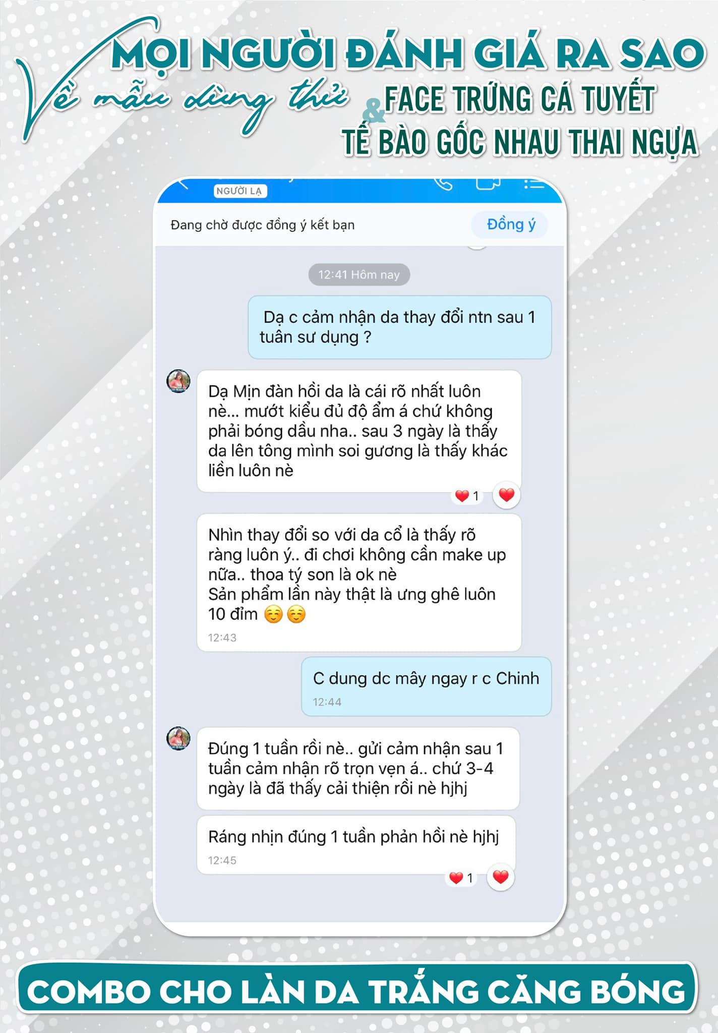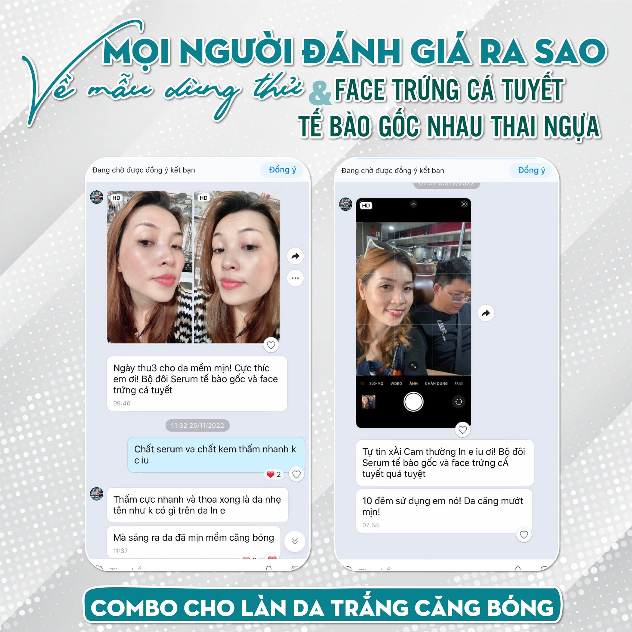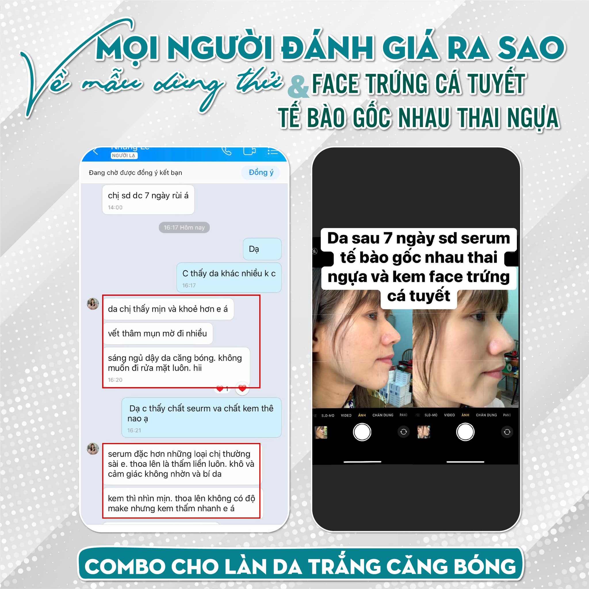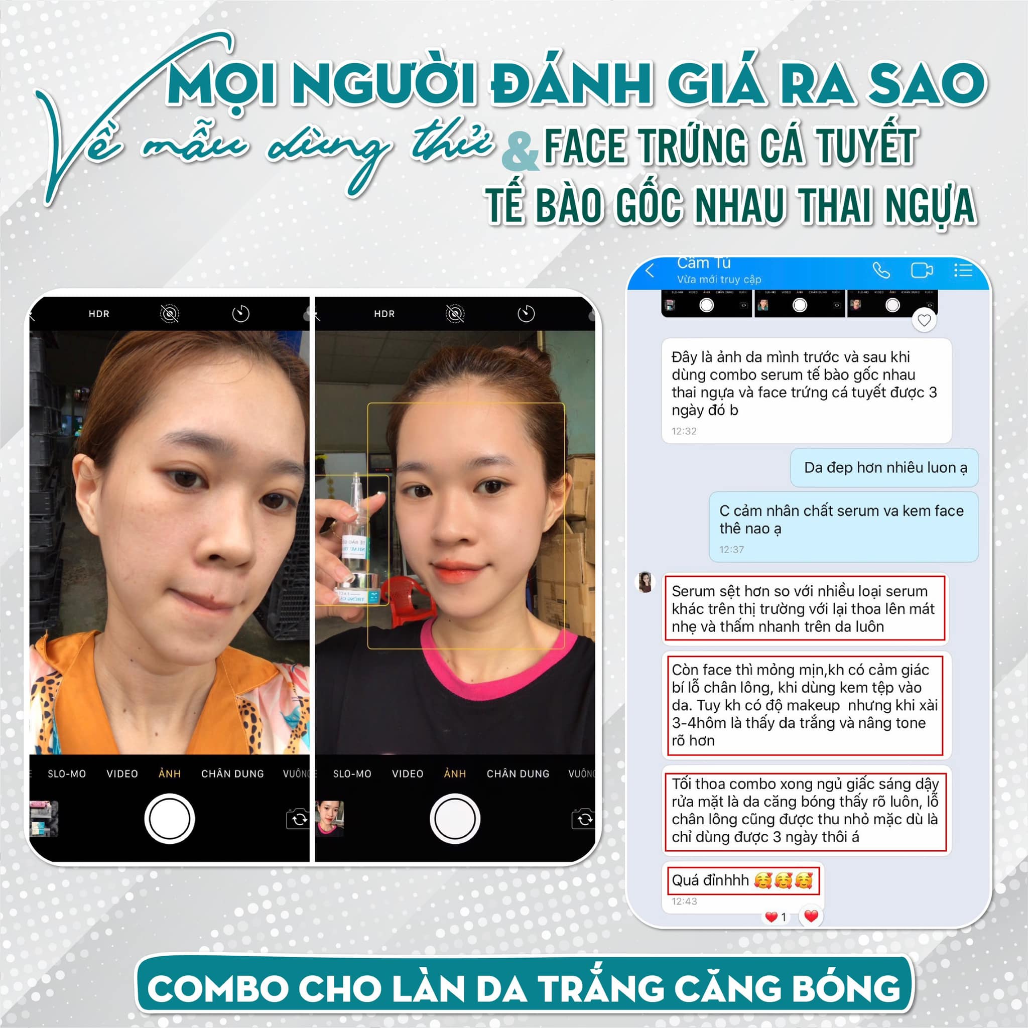 - Sử dụng bộ đôi này không bị bết dính, không lộ kem, thoa là thấm và mềm da, cấp ẩm duy trì độ ẩm cho da cả ngày. Làn da khô hay da mẫn cảm dùng combo face trứng cá tuyết và tế bào gốc nhau thai ngựa da sẽ luôn mềm mịn căng bóng.