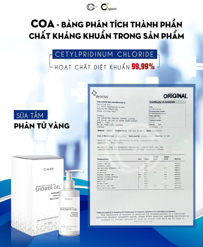 Thành phần của sữa tắm phân tử vàng này đó chính là Cetylpridinum Chloride, hoạt chất diệt khuẩn này thường được sử dụng như một thành phần hoạt chất trong các loại nước súc miệng không cần kê đơn, kem đánh răng, thuốc ngậm và thuốc xịt miệng, nơi thường được chỉ định để khử trùng.