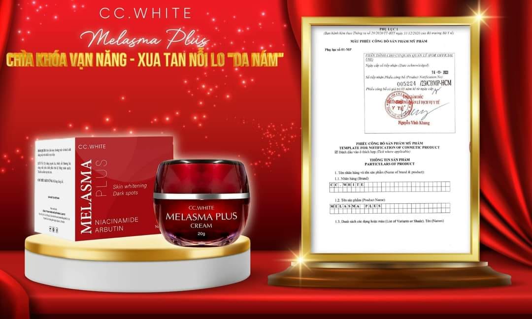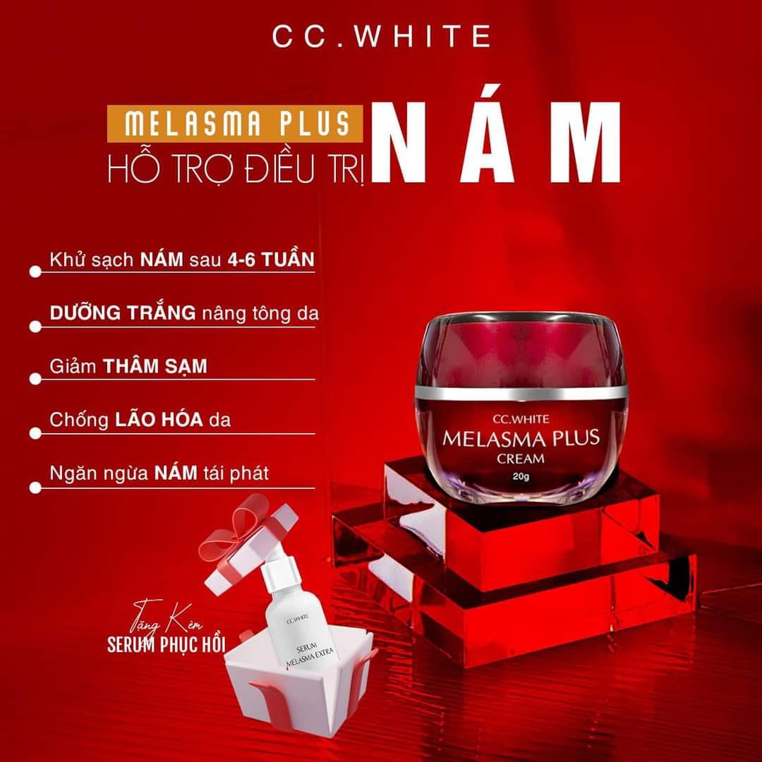 THÀNH PHẦN CỦA KEM NÁM MELASMA PLUS CC WHITE.: Aqua, Cyclopentasiloxane, Oryza Sativa Bran Extract, Vaseline, Momordica Charantia Extract, Panthenol, C30-45 Alkyl Dimethicone, Cetyl Alcohol, Tocopheryl Acetate, Niacinamide, Gluconnolactone, Acetyl Glycyl Beta - alanime, Allatoin, Arbutin, Phenoxyethanol 0,5, Perfume, Salicylic Acid 0,1.