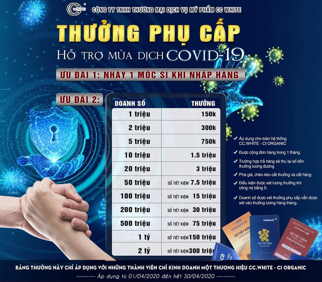 Trợ cấp mùa dịch cho các thành viên kinh doanh mỹ phẩm CC White trong tháng 4 nhằm hỗ trợ động viên mọi người trong mùa dịch covid19. Công ty thực hiện xuyên suốt chiến dịch này trong tháng 4 ngoài bảng lương thưởng mọi người vẫn được nhận.